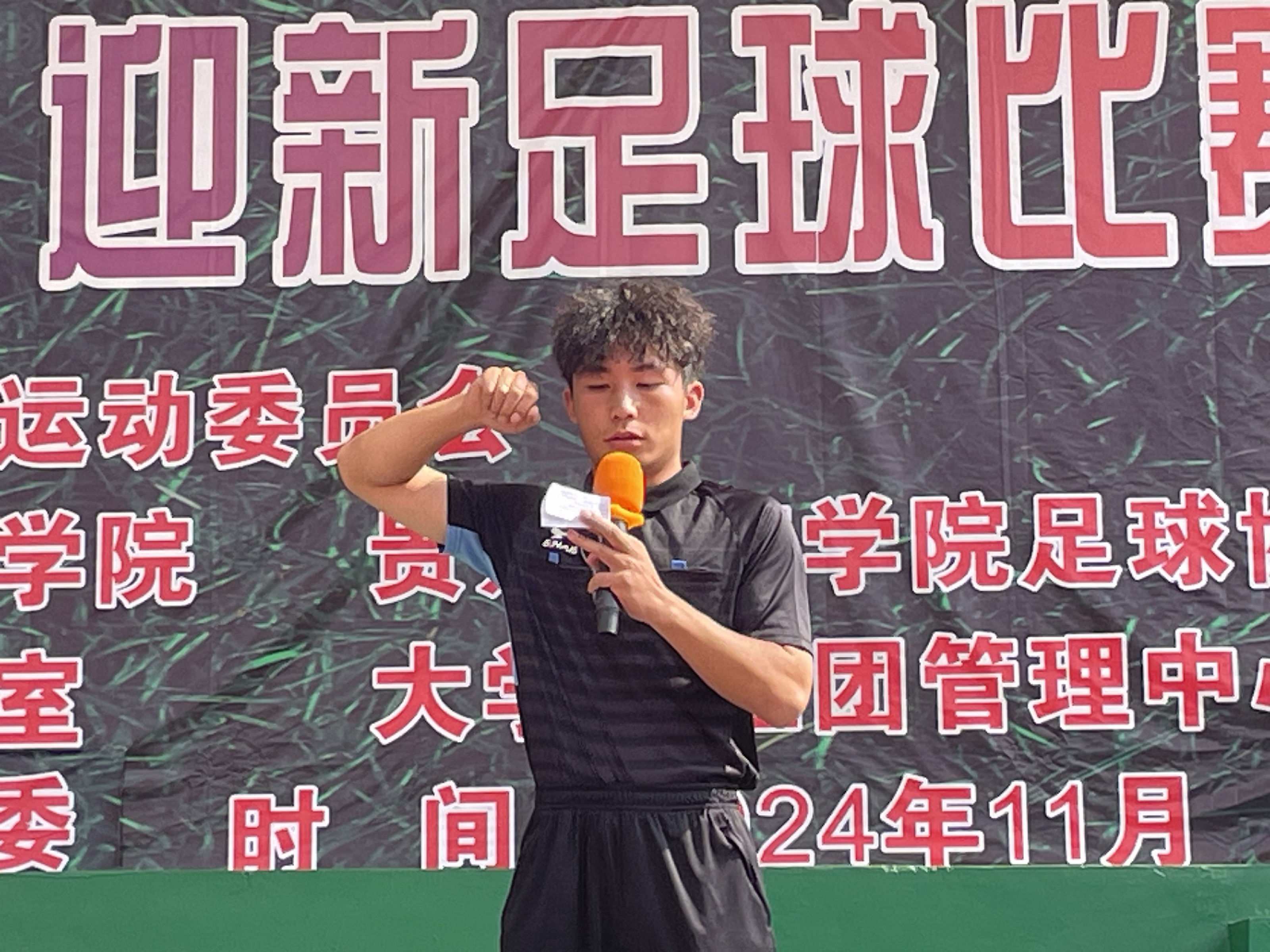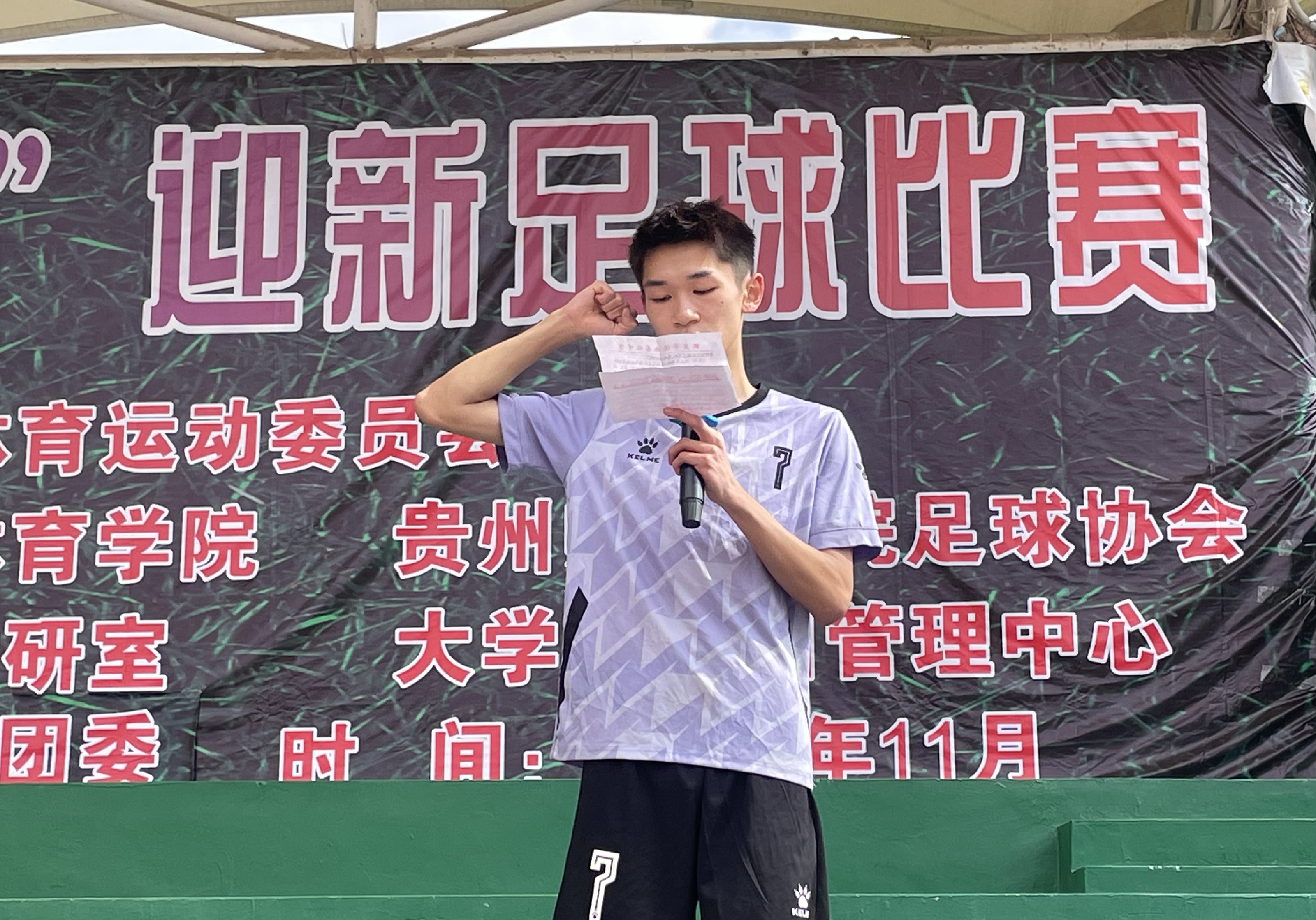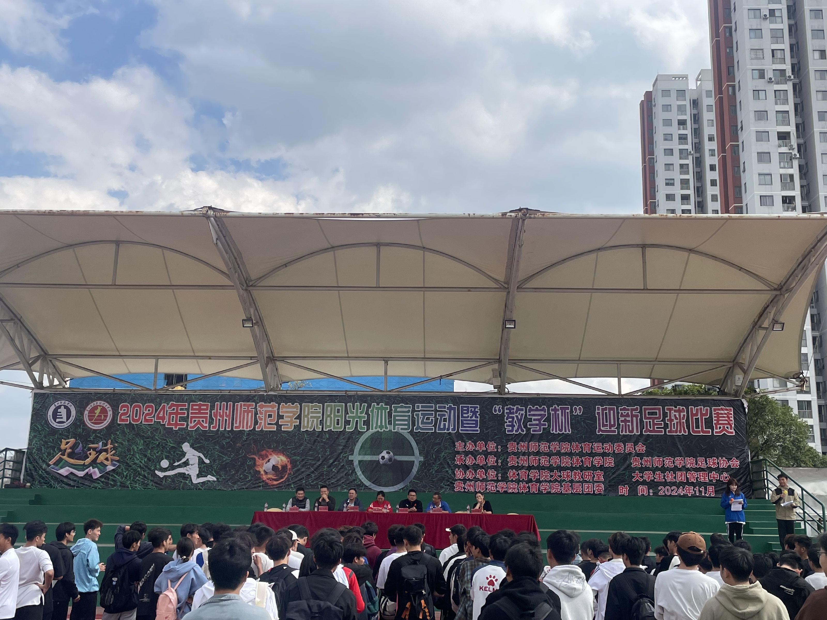 11月12日中午,2024年贵州师范学院阳光体育运动暨“教学杯”迎新足球比赛在学校足球场拉开了帷幕。best365英国体育在线党委书记汤士波、院长邬孟君、党委副书记刘华伟、副院长朱继伟、体育教育系主任樊庆岗、团委负责教师杨友娣及大球教研室主任刘新冬出席开幕式。